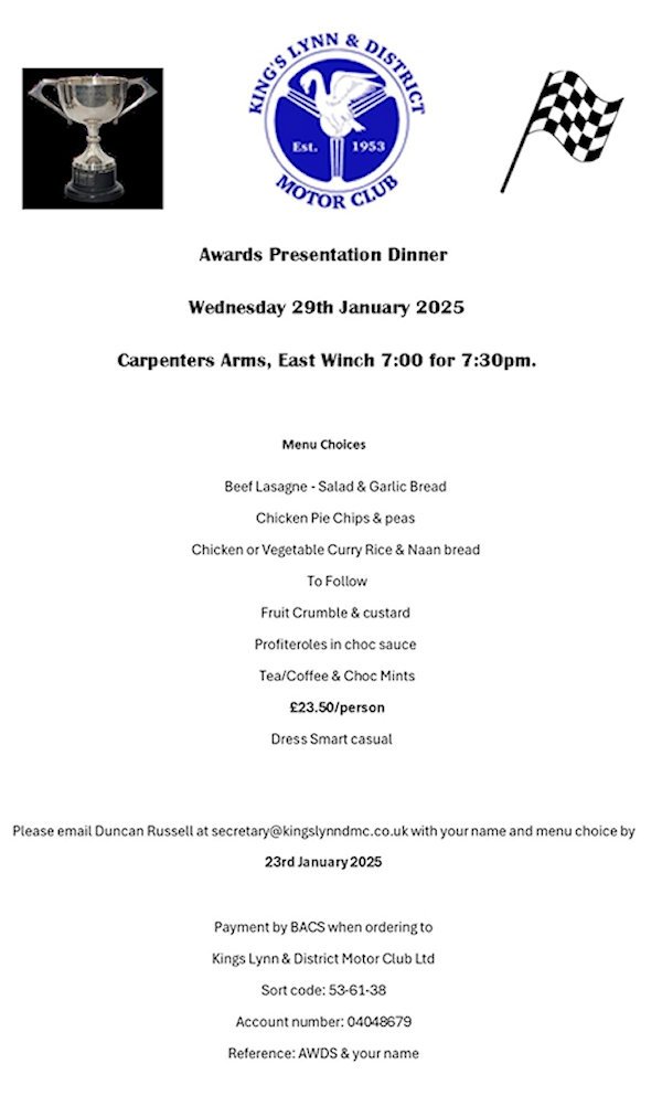 We have our awards evening coming up Wednesday 29th January 2025 contact Duncan at secretary@kingslynndmc.co.uk to book your place and menu choice by 23rd January 2025, we hope to see as many members and friends there to clap and congratulate our winners.